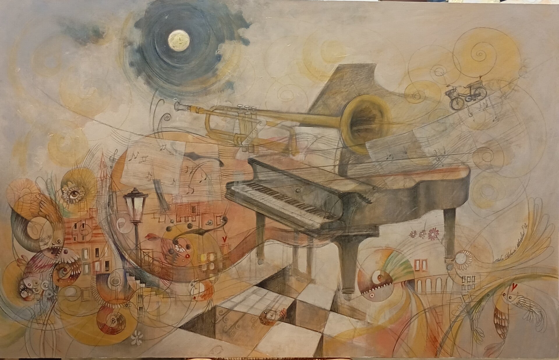 Strumenti musicali, sogno, luci , apertura di cielo e la mia bicicletta in equilibrio sul filo....sempre un pezzo unico....per arredare sognando🎨
